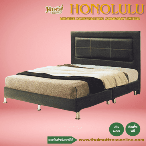 เตียงหุ้มหนัง รุ่น HONOLULU หัวเตียงแผ่นใหญ่ มีความหนาและความสูงระดับปานกลาง ขาเตียงเป็นสแตนเลสและแผ่นยางกันลื่นอย่างดี ผลิตจากวัสดุไม้เกรดดีผ่านกรรมวิธีอบความร้อนจึงทำให้ไม้มีความทนทานมากยิ่งขึ้น รับประกันโครงสร้างเตียงนาน 5 ปีเต็ม ดีไซน์เรียบง่าย ให้คุณสัมผัสความลงตัวในราคาประหยัดที่แท้จริง สามารถเข้ากับเฟอรืนิเจอร์ในรุ่นอื่นๆได้อย่างดี